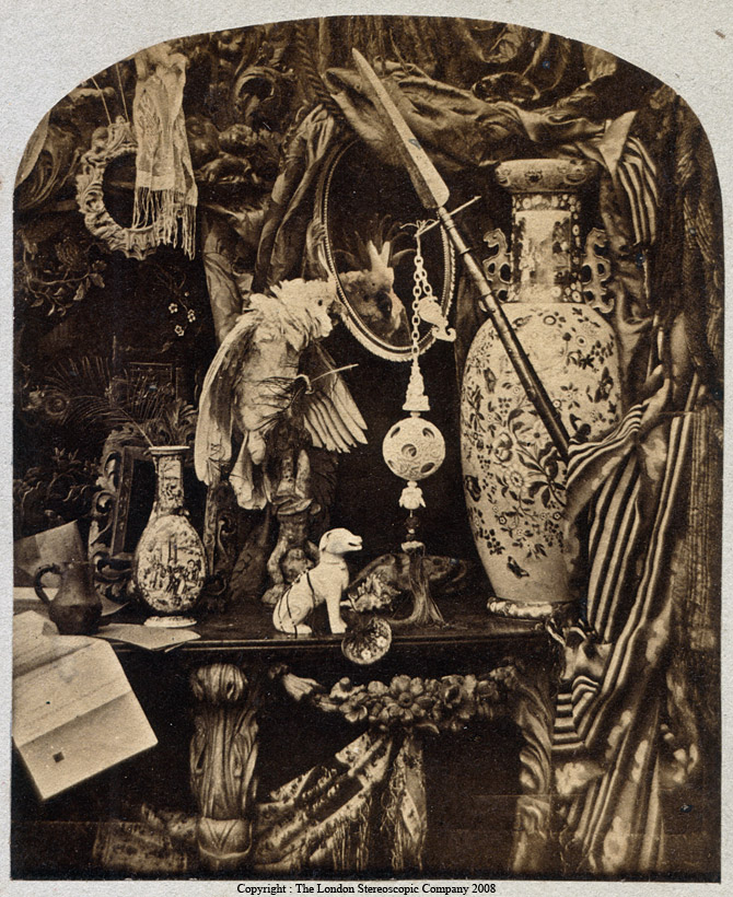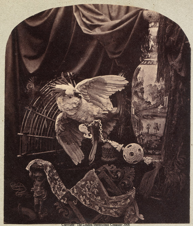 Todo este cuadro perfectamente ordenado y organizado podemos apreciarlo como un bodegón, que no naturaleza muerta ya que la puesta en escena nos hace creer que la cacatúa se está mirando a un espejo (obviamente el ave está disecada), en un ambiente cotidiano dentro de su rutina evidentemente lujosa puesto que el hogar que nos trasmite la fotografía con todo este despliegue de objetos perfectamente elegidos y suntuosos que no estaban al alcance de cualquiera, nos da una idea de hogar o mansión acomodada económicamente.